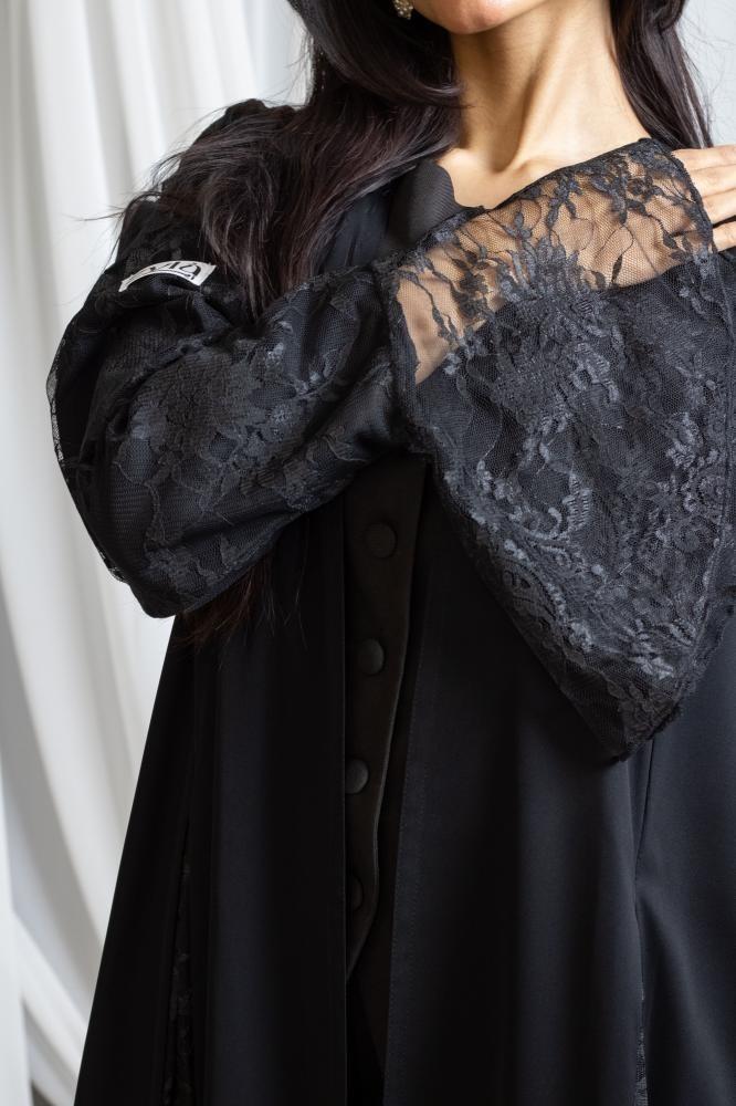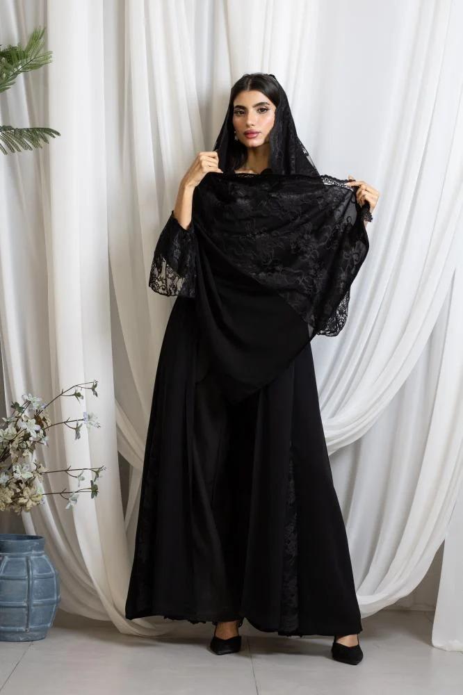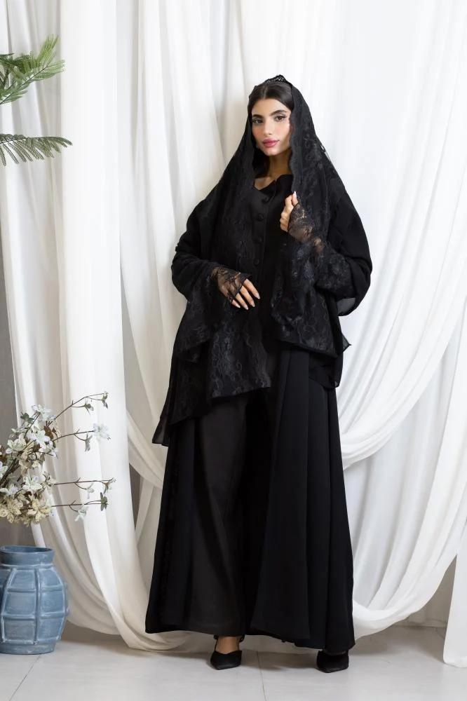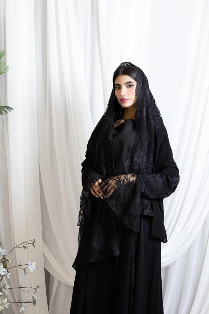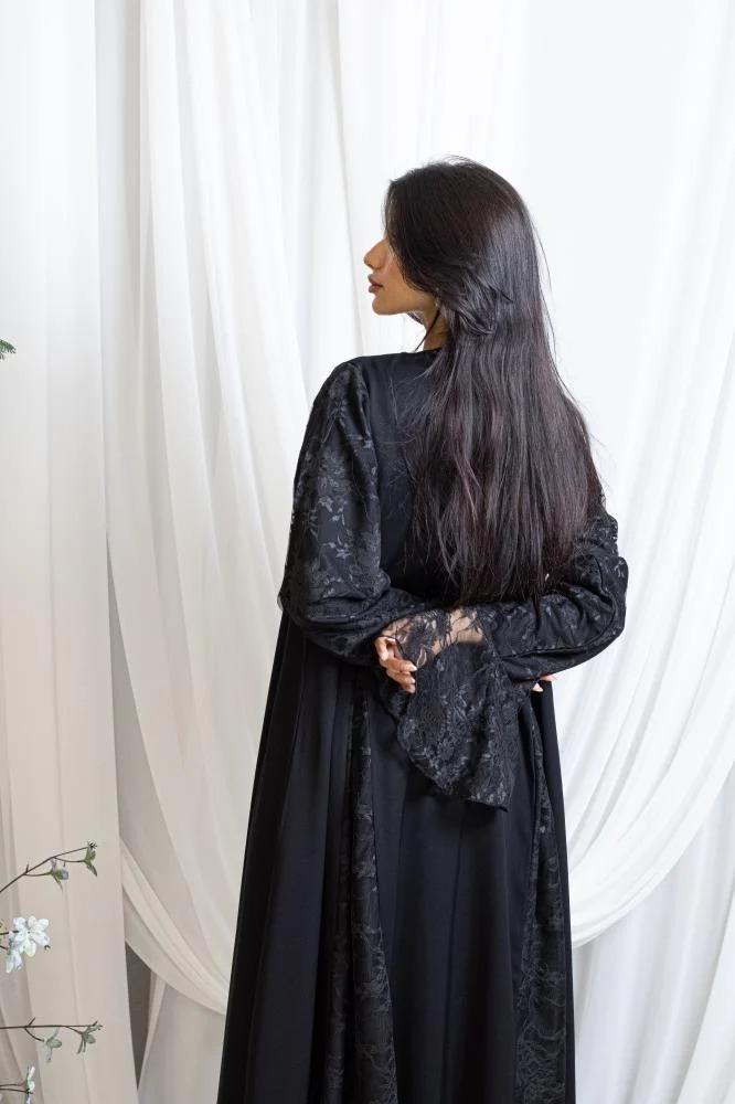 العبايه الكلوش باللون الأسود مع لمسات من الدانتيل الراقي تمنحك إطلالة ملكية متكاملة. تجمع بين الفخامة والأناقة بخامتها العالية وقصتها الكلوش العملية التي تضفي حركة انسيابية ساحرة تناسب جميع المناسبات الرسمية واليومية.