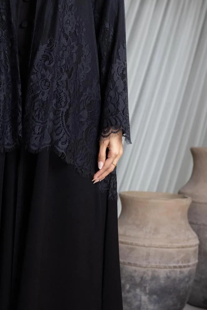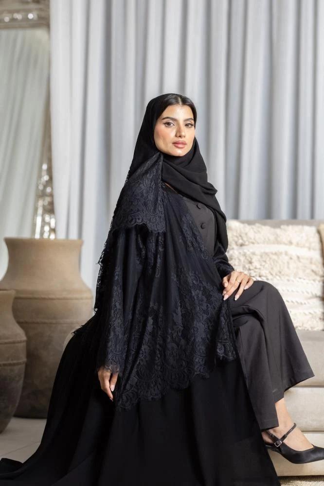 • عبايات دانتيل اسود تصميم ملكي يمنحك حضوراً لافتاً وجاذبية عالية