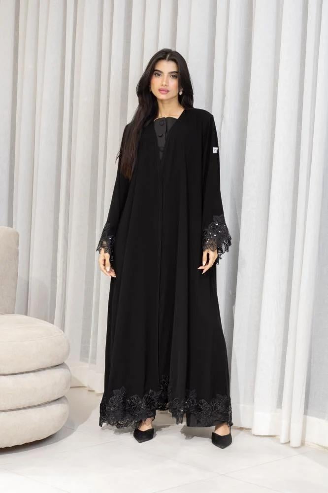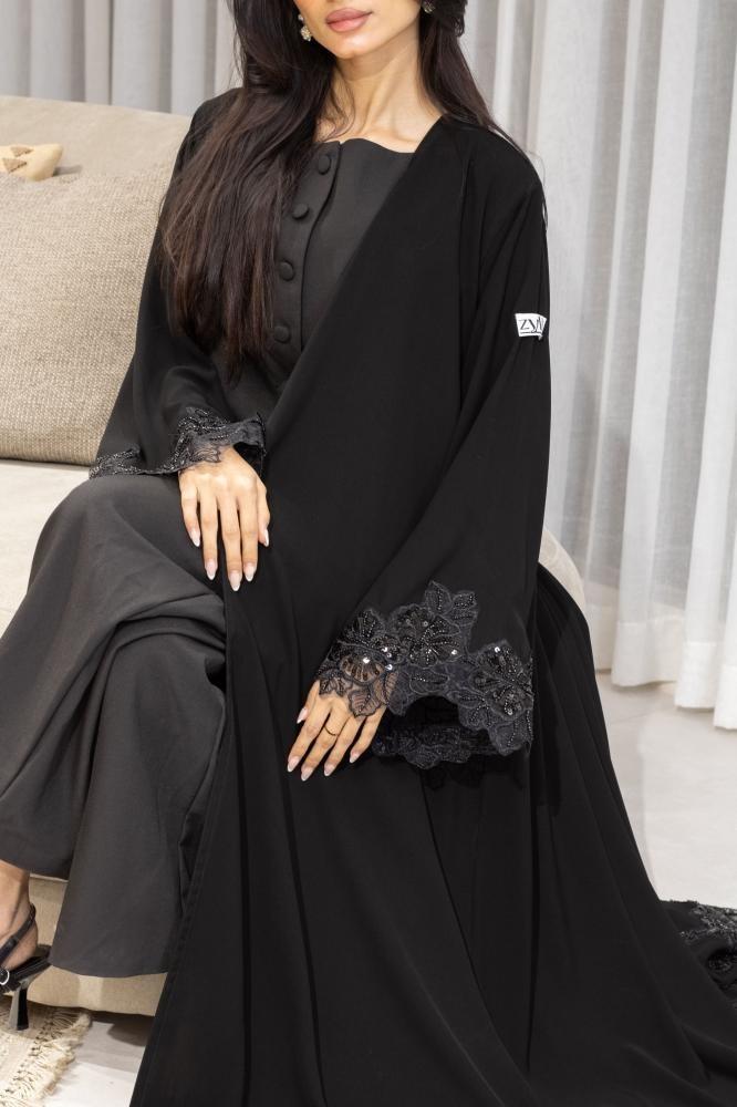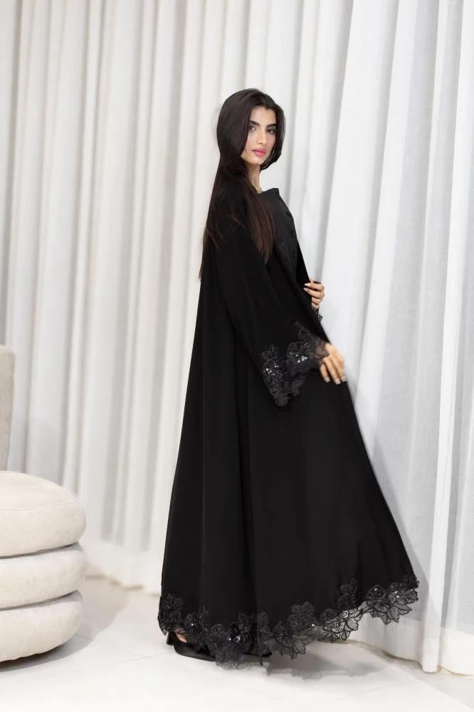 عبايات نصف كلوش ملكي فاخر باللون الأسود مع تفاصيل دانتيل أنيقة على الأطراف، تمنحك إطلالة فاخرة تجمع بين الرقي والأنوثة. قصتها العملية تضيف انسيابية مميزة، بينما خامتها الفاخرة تجعلها خياراً مثالياً للمناسبات الخاصة والإطلالات اليومية الراقية.