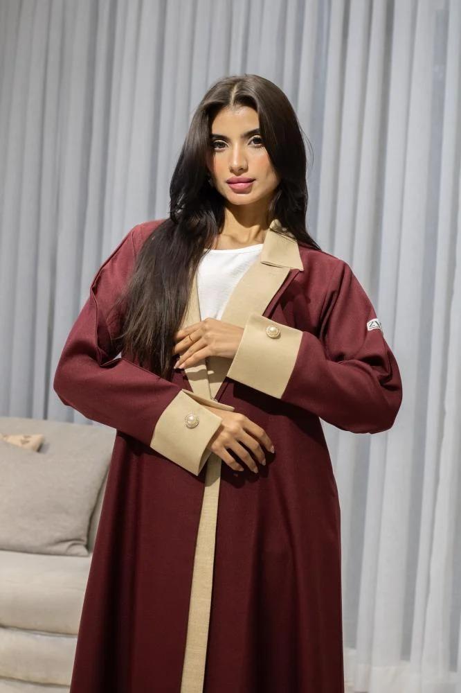 عباية نصف كلوش كتان تيواي بتصميم بليزر أنيق باللون البرغندي والبيج، تمنحك إطلالة عصرية تجمع بين الفخامة والعملية. تفاصيلها الراقية تضيف لمسة من التميز والأنوثة، وخامتها المريحة تجعلها مثالية للمناسبات الخاصة والإطلالات اليومية الراقية.