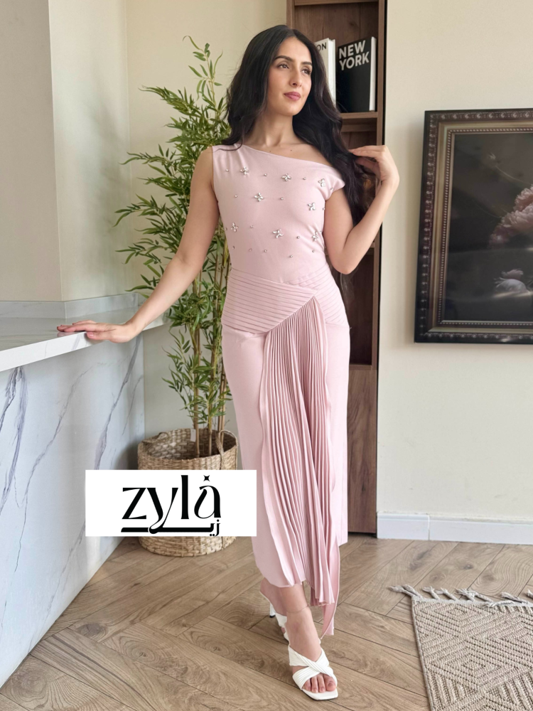 فستان بكسرات وكريستال يضفي لمسة من الأناقة والفخامة على إطلالتك. تصميم فريد يجمع بين الراحة والجمال ليمنحك إطلالة ساحرة ومثالية للمناسبات الخاصة.