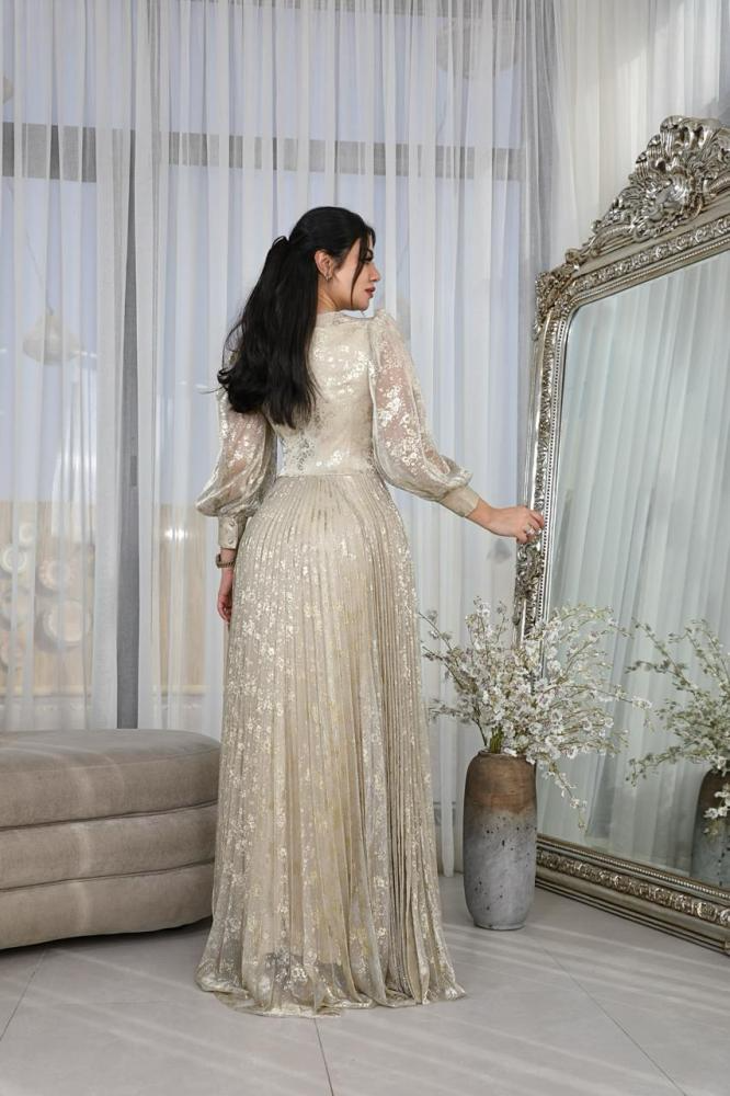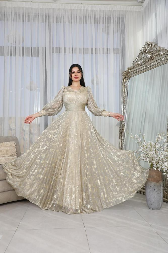 فستان سهرة ملكي بتفاصيل خاصة مع أكمام فانوس. تصميم فاخر يعكس الأناقة والجمال ويجعل منك محط الأنظار في أي مناسبة. مثالي لإطلالة ملكية تنبض بالفخامة.