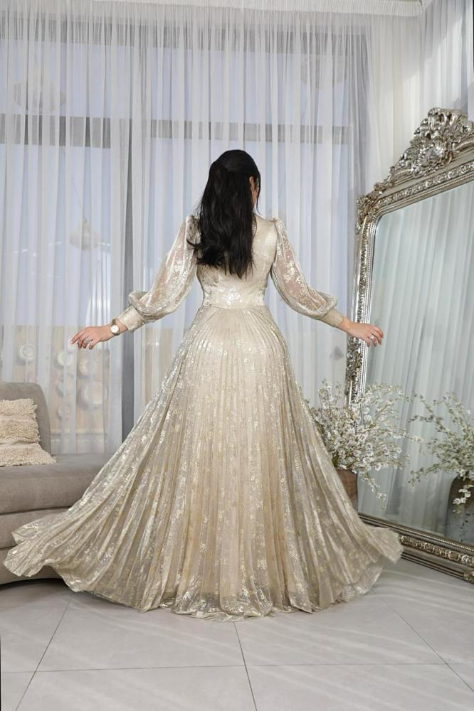 - اسم المنتج: فستان سهرة ملكي بتفاصيل خاصة مع أكمام فانوس